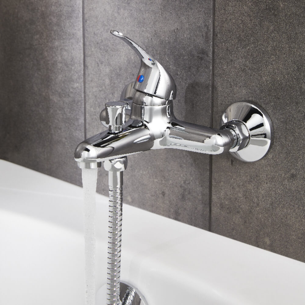 Baterie pentru Cada SanQ Sanobi, Finisaj Cromat, cu Pipa Scurta, cu Furtun si Para Dus, Baterie Cada SanQ, Baterie Cada Sanobi, Baterie pentru Cada, Sanobi Baterie Cada, Sanobi Baterie Cada Baie