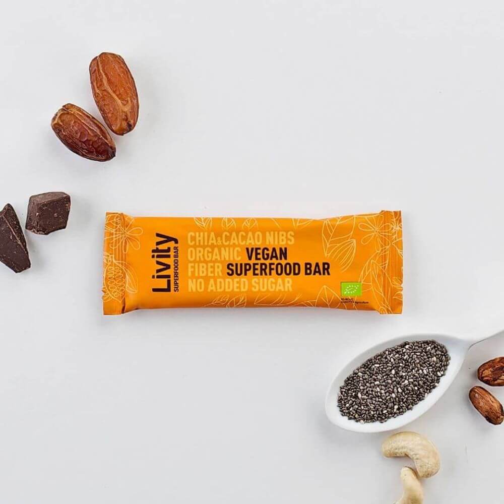Punem la dispozitie batonul proteic Livity Protein Chia&Cacao Nibs, greutate 46 g, cu seminte de chia si cacao, imbogatit cu fibre pentru a-ti satisfice pofta de dulce in timp ce iti mentii silueta de top. Cine spune ca in viata nu le poti avea pe toate?