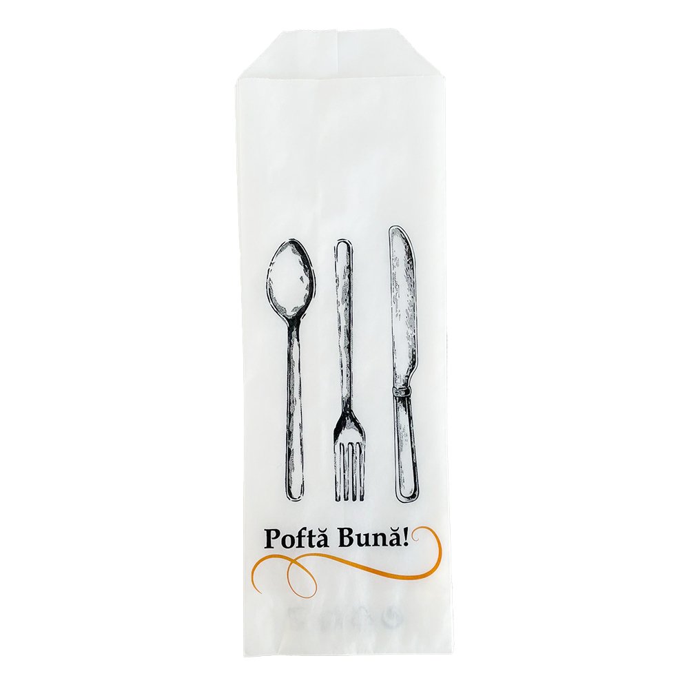 Iti recomandam setul de 2000 de plicuri pentru tacamuri realizate din hartie alba de 35 de g/m², cu imprimeu si dimensiuni de 8 pe 24 de centimetri.