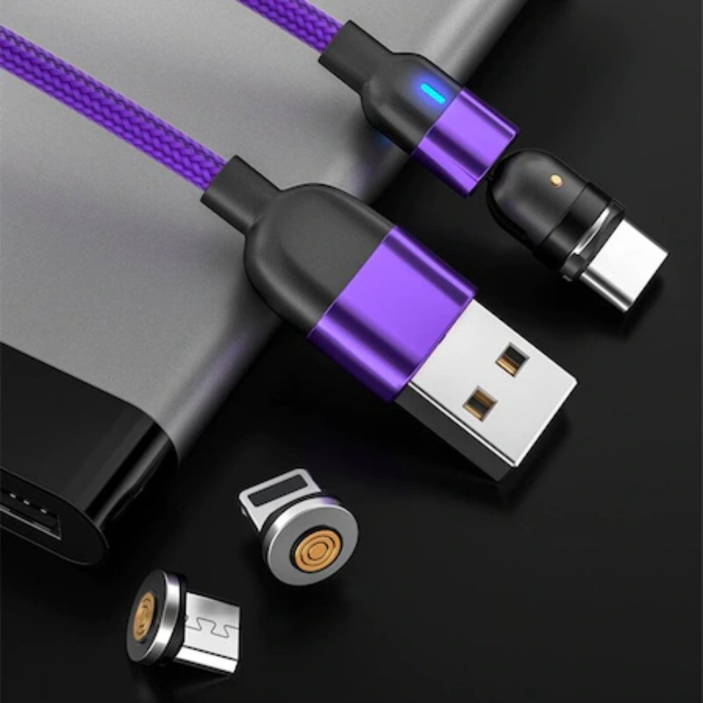 Cablu de Incarcare Violet 3 in 1 cu Conector Magnetic Rotatie la 540°, Incarcare 5V 2.4A, 2 Metri, Conector pentru IOS/Android/USB-C