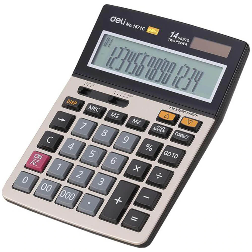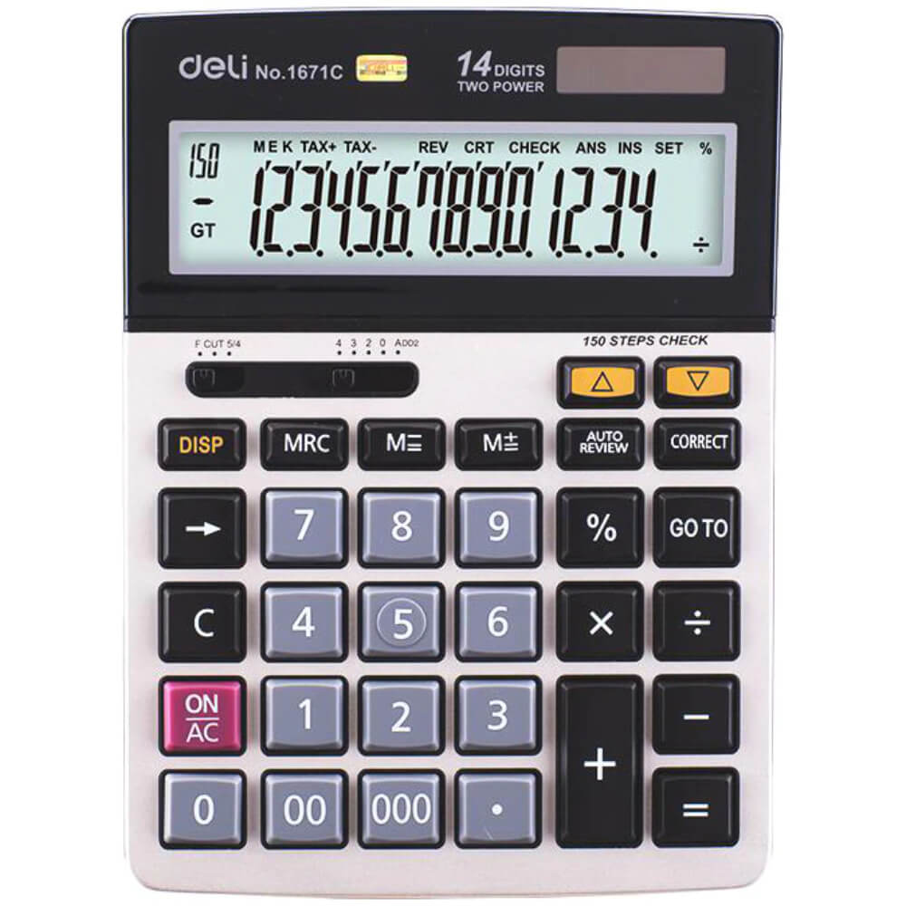 Calculator de Birou Deli 1671C, 14 Digits, Gri/Negru, Alimentare Dubla, Calculator Birou, Calculator Birou 14 Digits, Calculator Birou cu Verificare si Corectie, Calculator Birou Deli