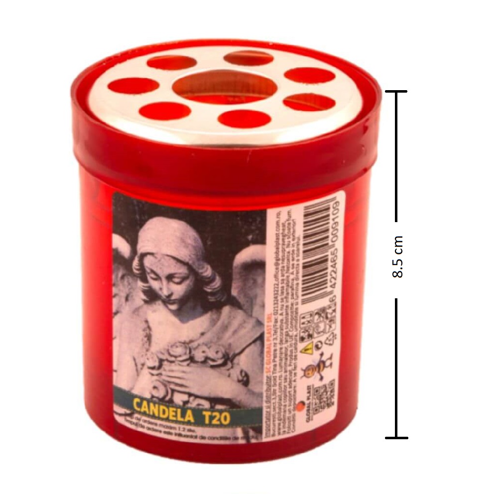 Oferim candela tip 20 din parafina, dimensiuni 85x65 mm, cu capac metalic de protectie, prevazuta cu suport din plastic de culoare rosie si cu timp de ardere pana la 30 h. Ideal pentru ceremonii exterioare sau chiar pentru masa de sarbatori.