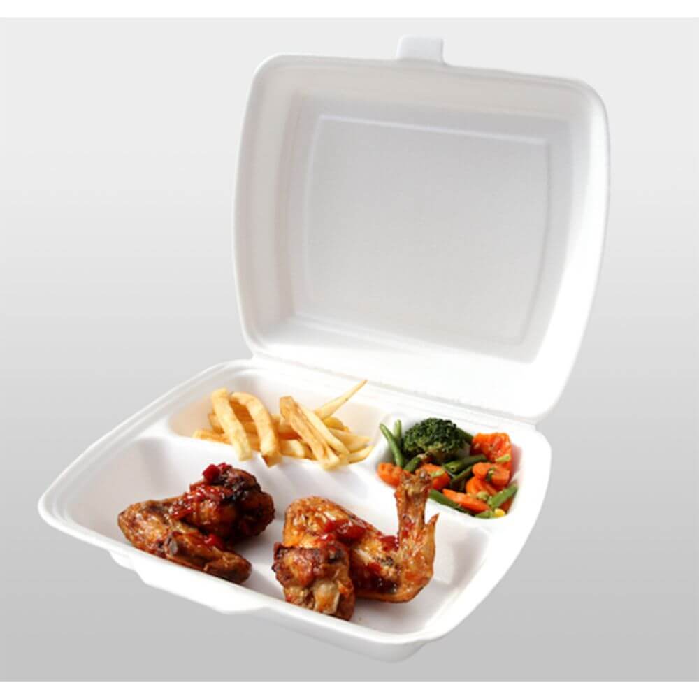 Caserole Meniu, 24x22x7.5 mm, 200 Buc/Set, Polistiren Expandat, 3 Compartimente, Culoare Alba, Caserole Polistiren, Caserola Unica Folosinta Polistiren, Caserole Compartimentate cu Capac, Ambalaje Catering, Caserole Fast Food, Caserola Meniu