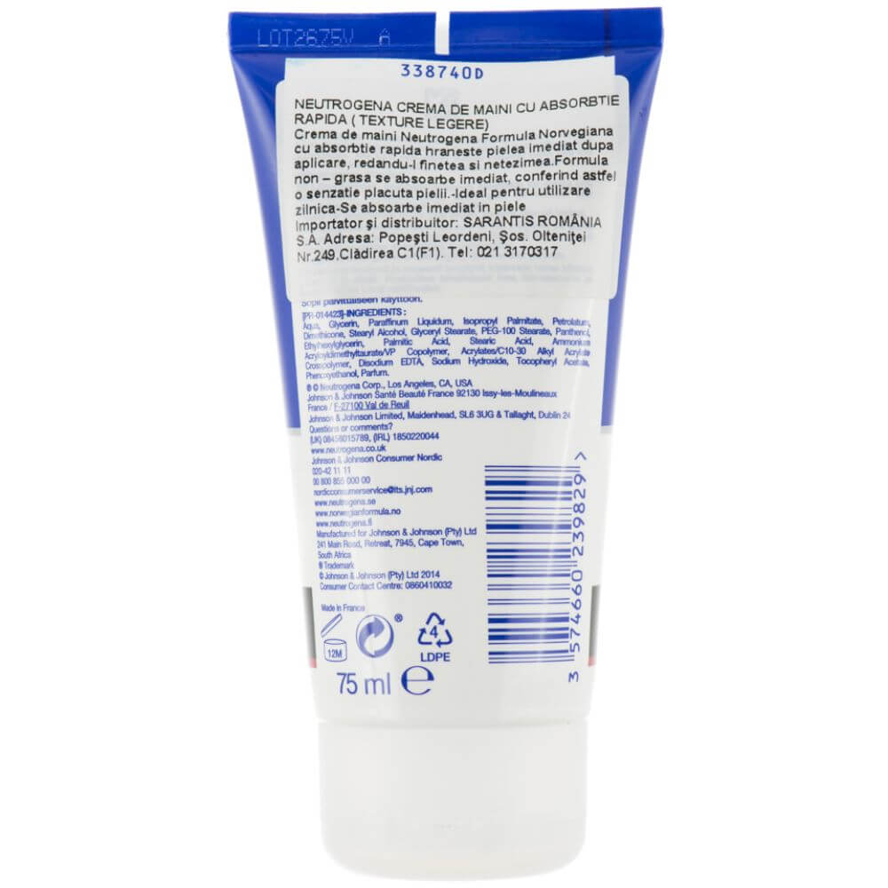 Crema de Maini Neutrogena Fast Absorbing, 75 ml, Neutrogena Creme de Maini, Crema Hidratanta pentru Maini Aspre, Neutrogena Crema Hidratanta de Maini Crapate, Crema Hranitoare pentru Piele Uscata, Neutrogena Crema Protectie Piele Uscata