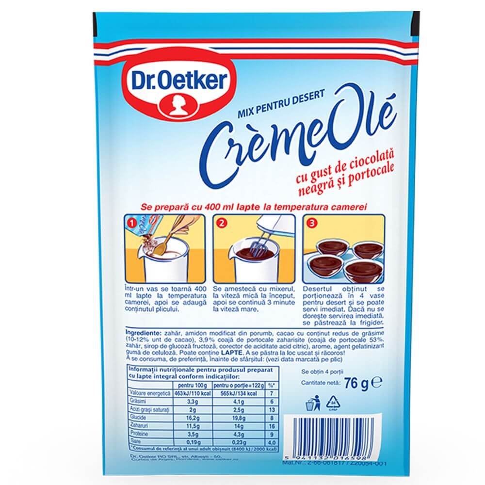 Oferim mix pentru creme Ole Dr. Oetker, cantitate 76 g cu aroma de ciocolata neagra si portocale. Timp de preparare: 3 minute.