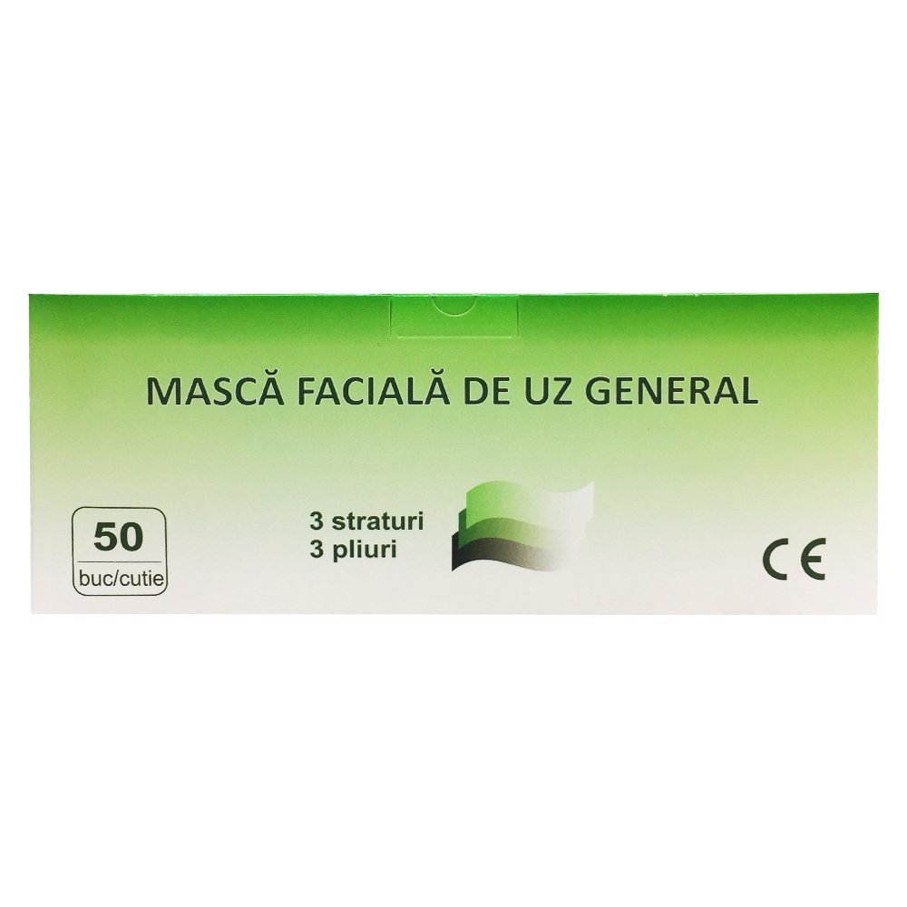 Cutie 50 de Masti Faciale de Uz General, Global Treat, 3 Straturi si 3 Pliuri, Masca de Protectie, Masca Faciala, Masti de Protectie, Masti Medicale, Masti Protectie Medicale, Masca Medicala, Masca Uz Medical, Masca pentru Fata, Cutie Masti