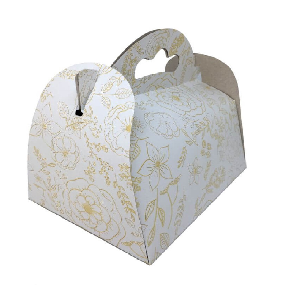 Comercializam cutii pentru prajituri cu model floral din carton duplex alb 450 g/m² cu autoformare, 25 buc/bax, avand dimensiunea 14x20 cm, maner practic si deschidere laterala. Confectionate special pentru depozitarea si transportul individual, in conditii optime sunt ideale pentru produse de cofetarie si patiserie.