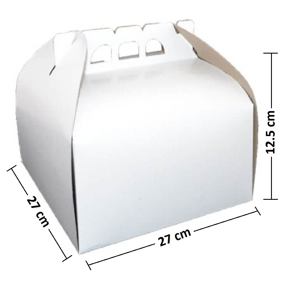 Comercializam cutii pentru tort din carton duplex alb, cu dimensiunea de 27x27x12.5 cm, cu autoformare, deschidere laterala si maner practic, cate 25 buc/bax. Ambalajele sunt concepute pentru depozitarea si manipularea torturilor, prajiturilor si altor produse de cofetarie sau patiserie.