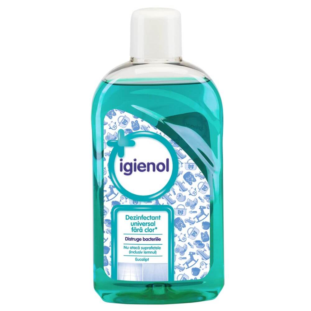- Igienol dezinfectant universal este special conceput pentru igienizare si curatenie, fara clor (hipoclorit de sodiu), pentru orice tip de suprafete, de la gresie, faianta, lemn,