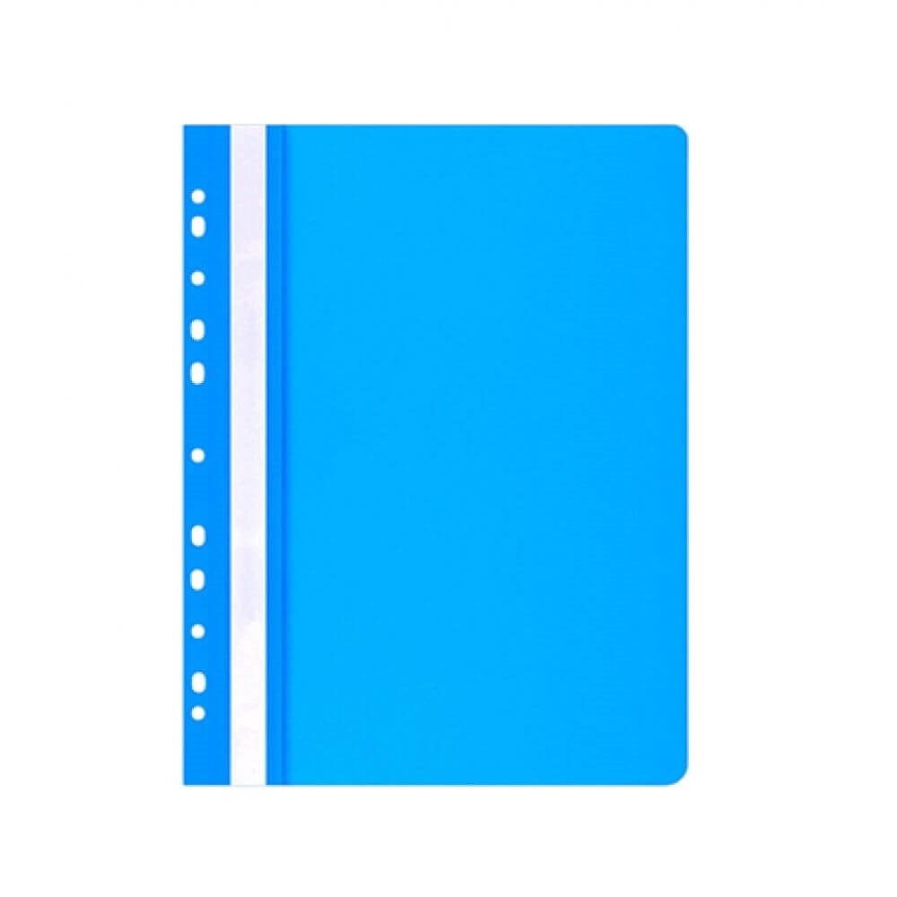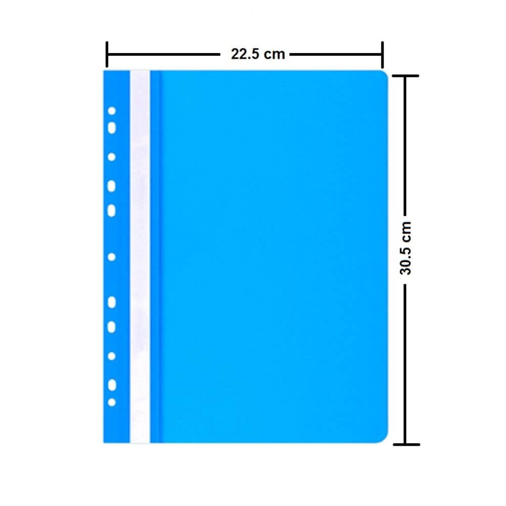 Vindem set de 25 de dosare din plastic rezistent albastru cu sina si multiperforatii cu dimensiunea de 225x305 mm, format A4. Dosarele sunt necesare pentru organizarea unei cantitati mici de documente la care ai acces frecvent pentru scoala sau birou.