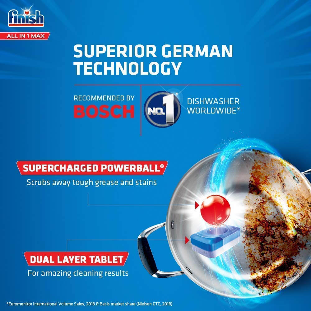 - Finish All in 1 Max este recomandat de marii producatori de masini de spalat vase, datorita eficientei sale dovedite;