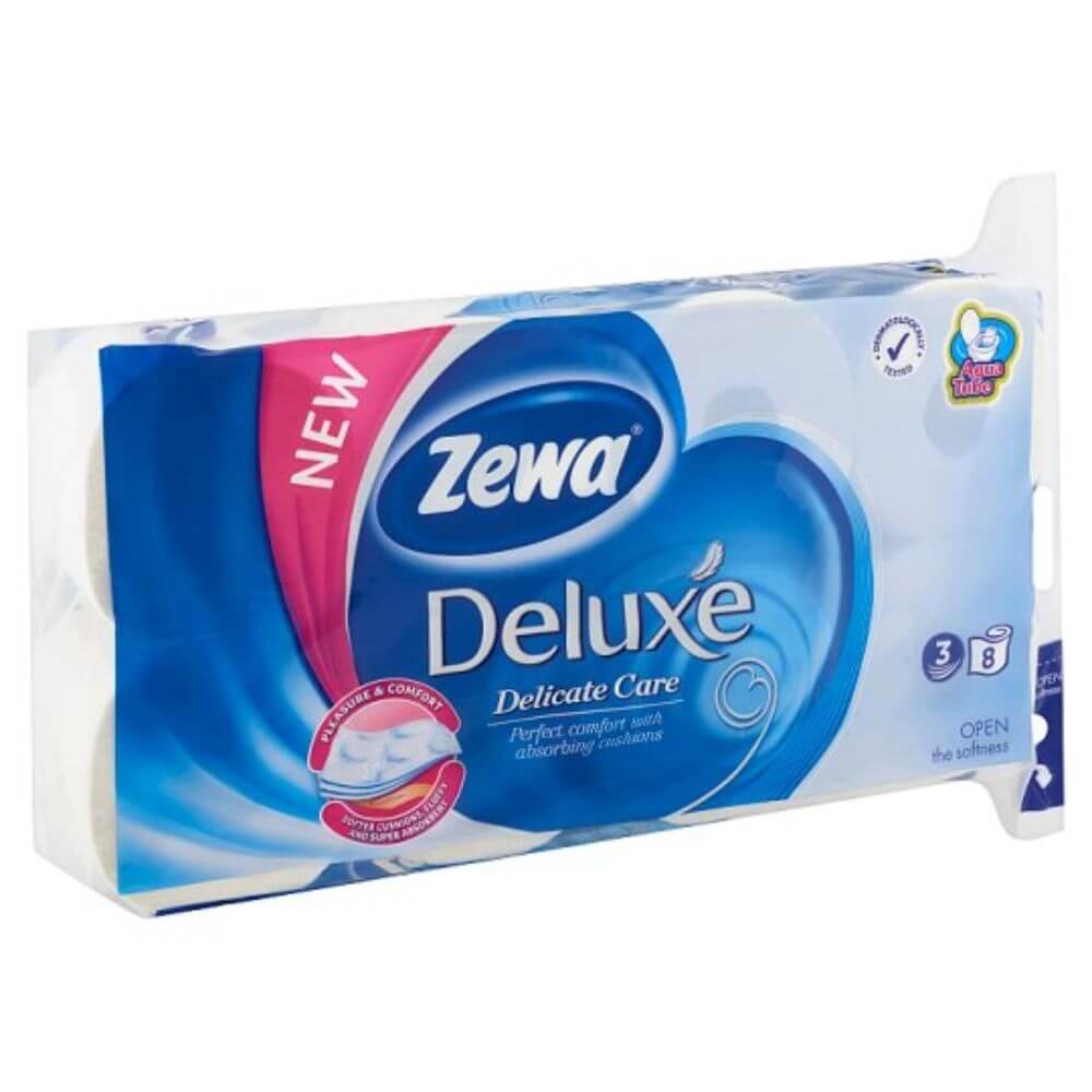 Iti oferim hartie igienica de calitate superioara Zewa Deluxe in 3 straturi, fara parfum, design simplu, alb si latime de 94 mm. Oferta este disponibila la bax de 8 role, fiecare rola cu 150 foi. Hartia Zewa Deluxe se afla in topul preferintelor cumparatorilor fiind apreciata pentru textura moale si delicata la contactul cu pielea.