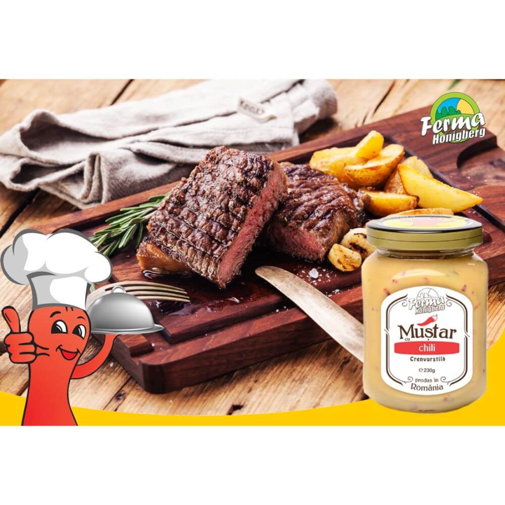- Ingrediente: apa, boabe de mustar alb, chili verde(1,5%), chili iute rosu (3,5%), otet din vin, faina de grau, zahar, sare, ulei vegetal din floarea soarelui, condimente naturale, betacaroten;