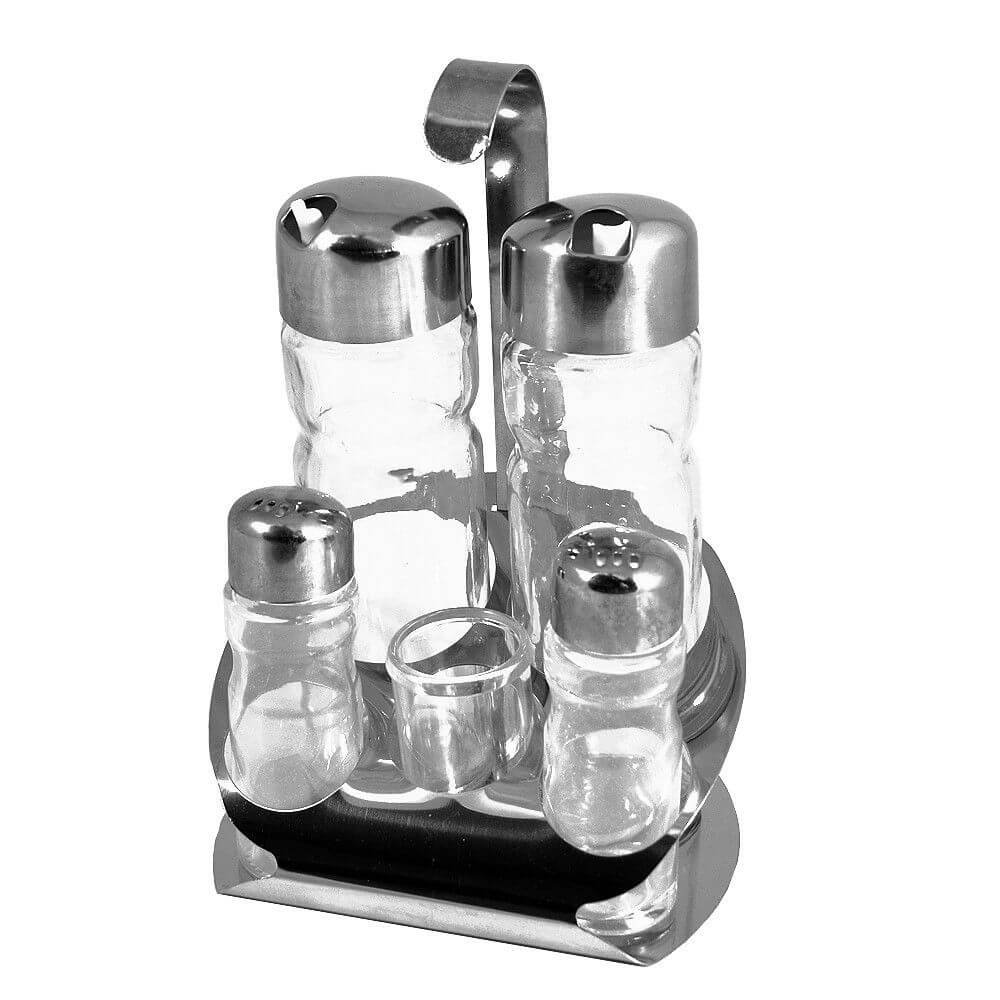 cu suport pentru scobitori si 4 recipente pentru condimente lichide si solide.