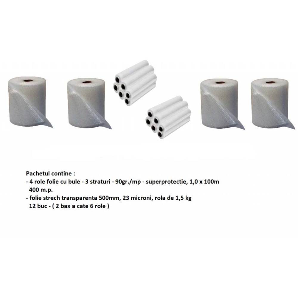Pachet Stretch Economic Contine 4 Role de Folie cu Bule de 3 Straturi, Dimensiuni 1m x 100 m + 12 Role Stretch Transparent, 23 MIC grosime, Latime 500 mm
