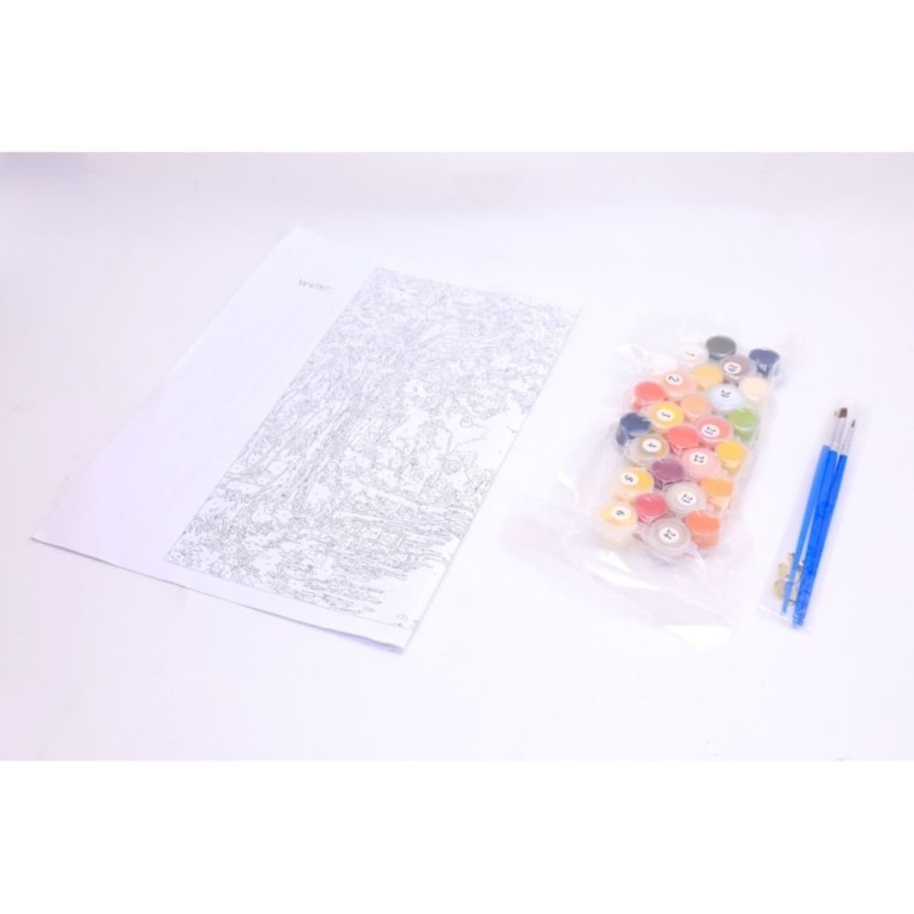 Panza Pictura Daco pe Numere, Material Bumbac, Dimensiune 30x40 cm, Gramaj 280 g/m², 24 Culori Acrilice si 3 Pensule Incluse in Set, Model Peisaj de Toamna