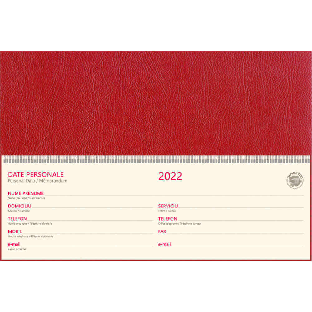 Cauti o agenda pentru planificarea intalnirilor saptamanale? Iti recomandam astazi planner de birou Ego Bref, de o culoare rosie. Agenda este datata 2022, cu 112 pagini de hartie ivory de 70 g/mp, tiparite in trei limbi cu gri si rosu si prinse intr-o spira metalica dubla, in culori asortate.