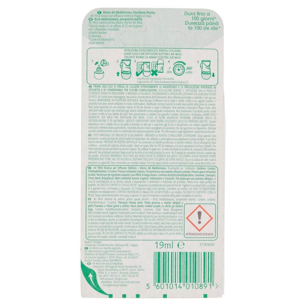 Iti doresti sa reinvii atmosfera caminului si sa aduci parfumul proaspat al brizei mediterane chiar la tine acasa? Noi iti aducem solutia care le imbina pe amandoua. Iti propunem rezerva de odorizant electric lichid, de la Air Wick, 19 ml, cu un parfum imbietor de briza mediteraneana, care te va lasa sa te bucuri de prospetime continua pana la 60 de zile.