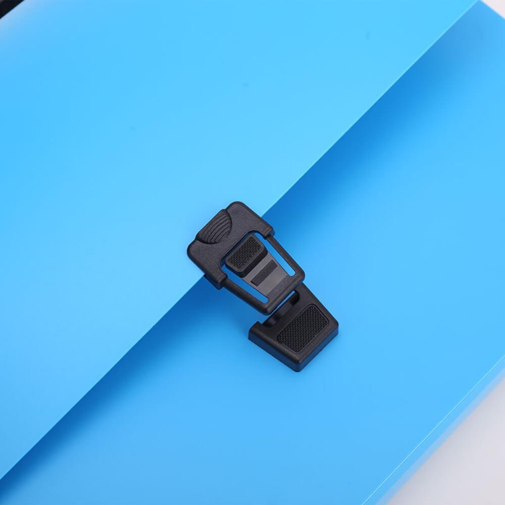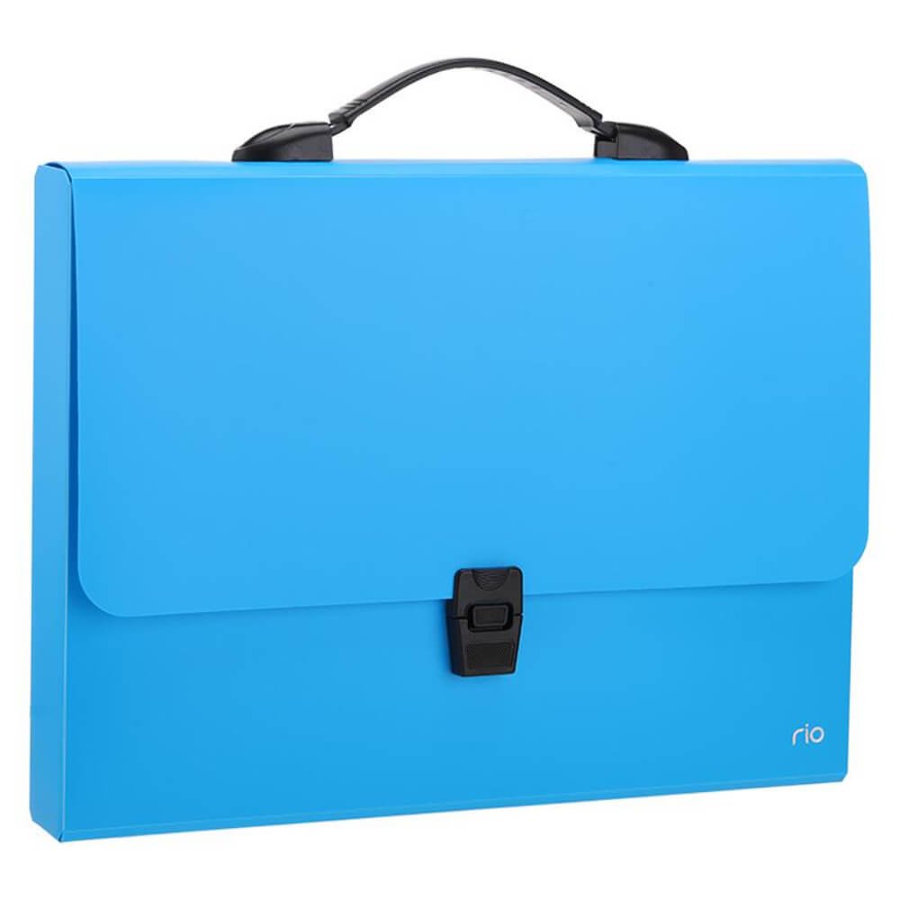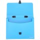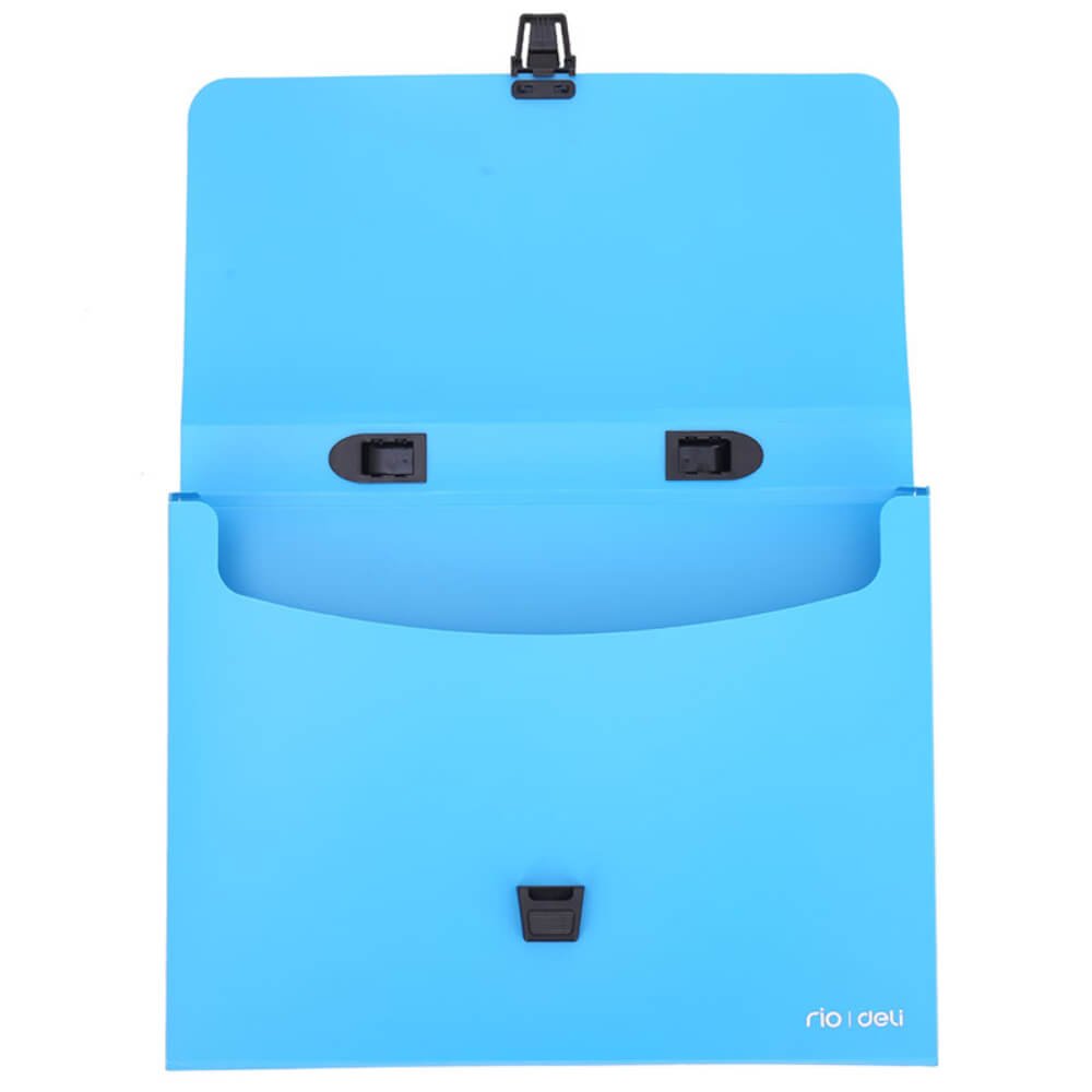 Oferim servieta din plastic cu inchidere si maner de plastic de la Deli, de o culoare albastra, ideala pentru