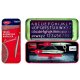 - Setul contine: compas, divizor, 2 echere, raportor, radiera, liniar, ascutitoare, creion, sablon litere, orar;
