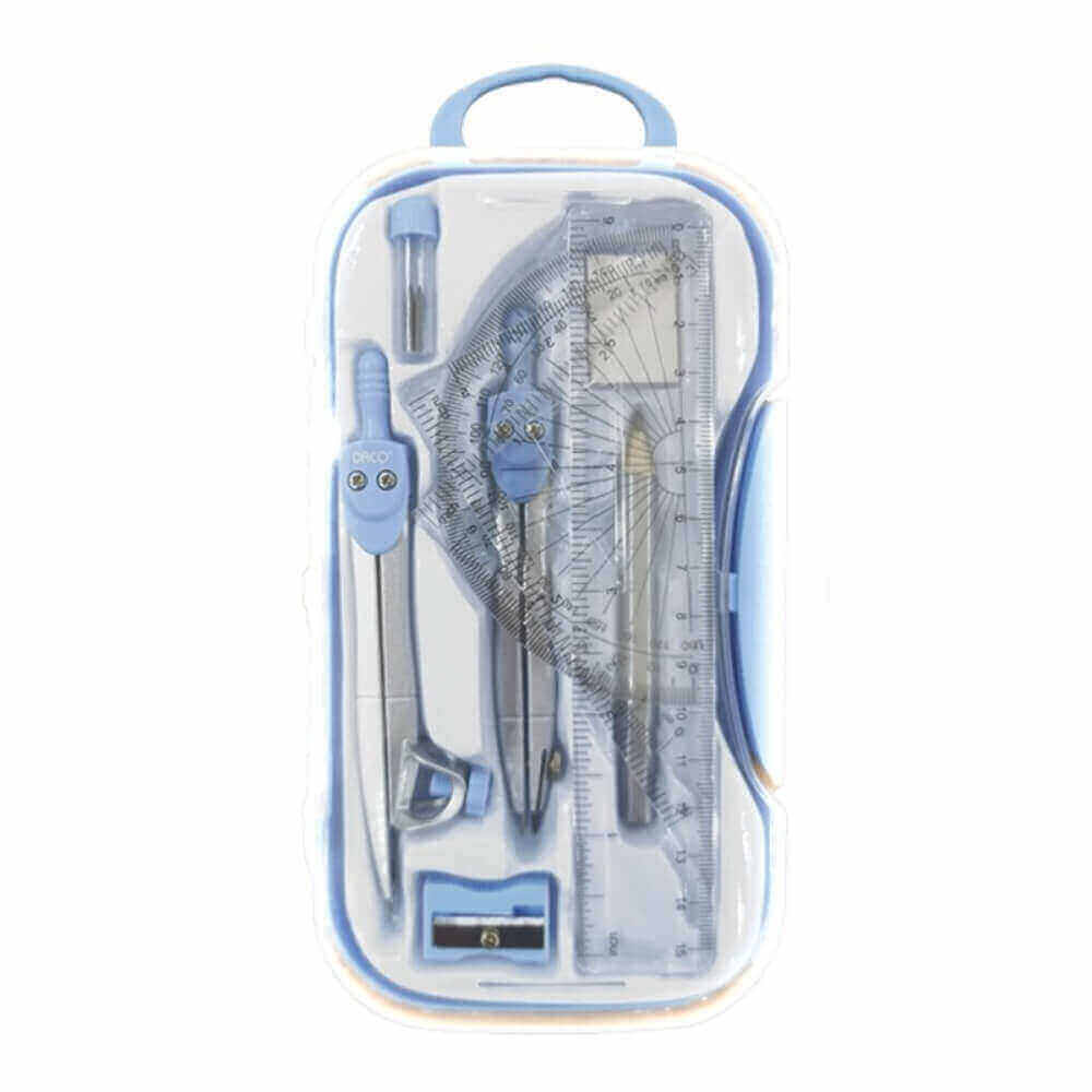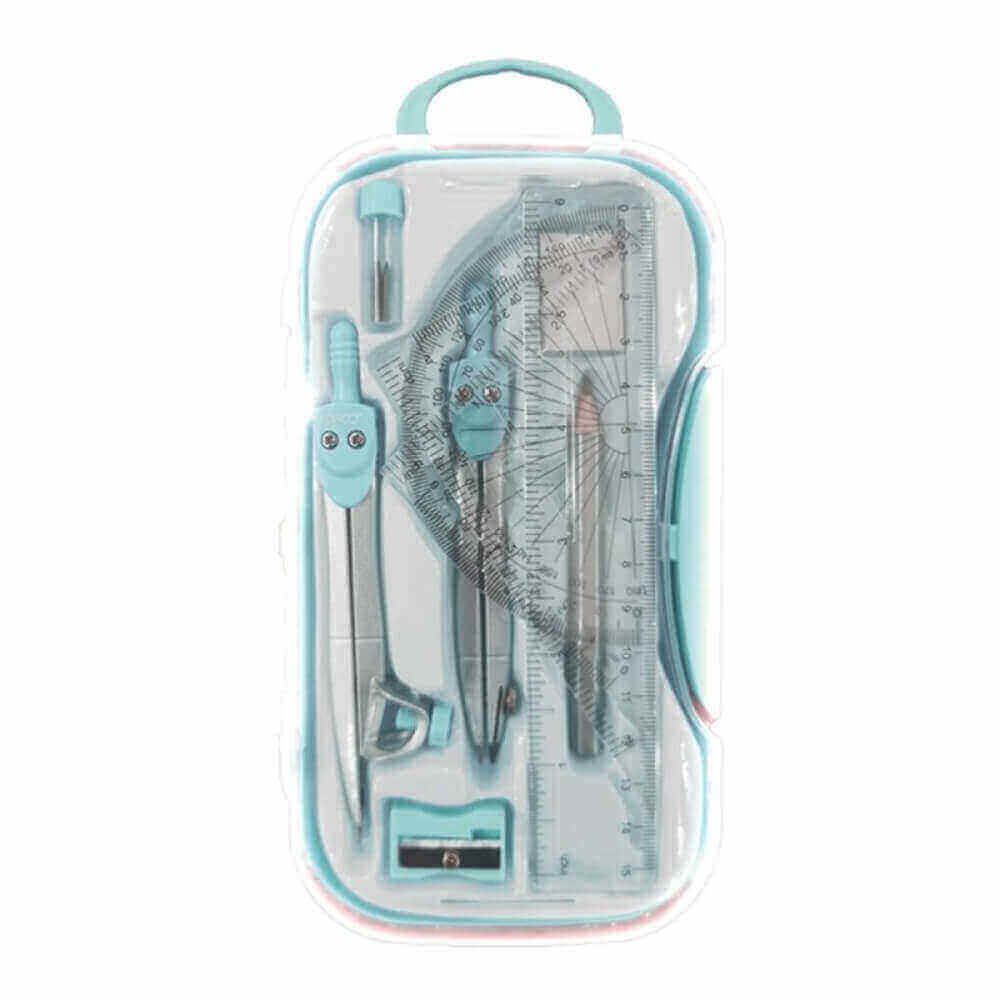 raportor, 1 ascutitoare, 1 radiera, 1 creion, 1 set mine compas, cutie plastic;